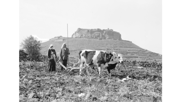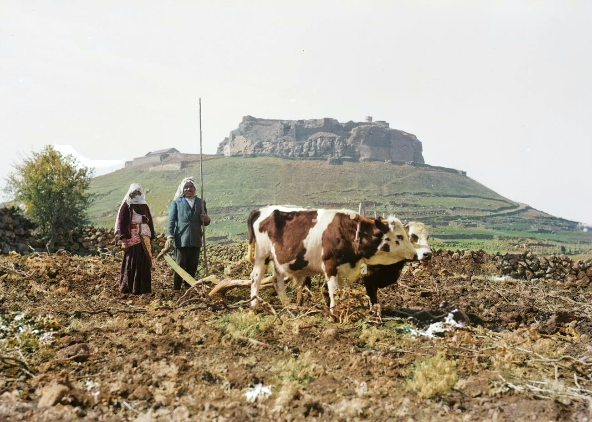 رجل وامراة يعملان في الارض وخلفهما تلة القلعة صلخد عام 1938م