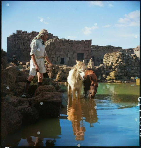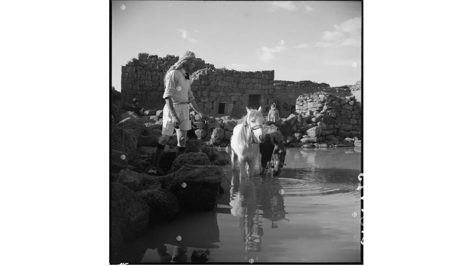 متسابق درزي يسقي خيله في بركة قرية في جبل العرب عام 1940/4/1م