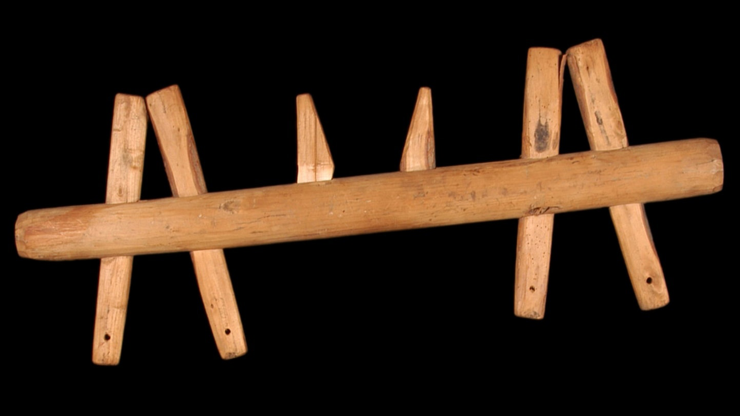أسطوانة خشبية بيضاء بطول 96 سم وقطر 6.5 سم يتم دفعها 3 أزواج من الأوتاد: زوج في المنتصف ، متعامد مع نير ، ولكن لا يعبره ؛ زوجان آخران في كل طرف يعبران نير بشكل غير مباشر ، بحيث تتلاقى نقاطهما في الجزء العلوي ، ويتم فصل الأطراف الأخرى. كل هذه الأوتاد مرتبة في نفس المستوى.