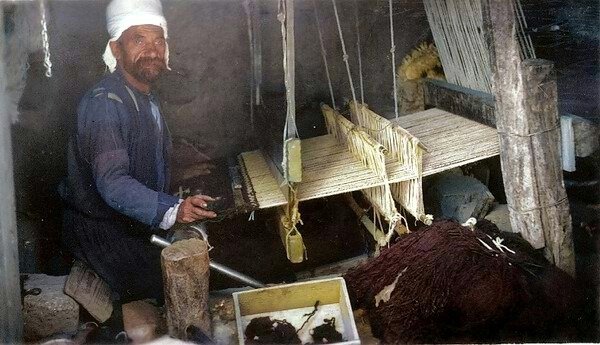 صورة لشيخ يعمل على نول صوف قديم في جبل العرب عام 1937.