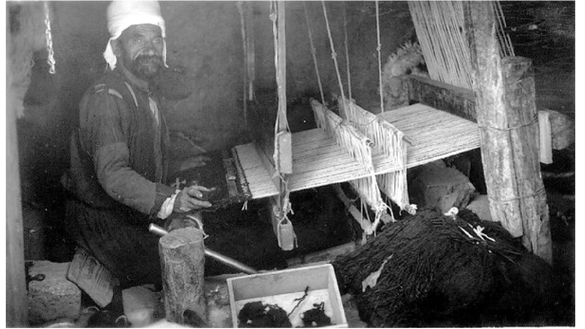 صورة لشيخ يعمل على نول صوف قديم في جبل العرب عام 1937.