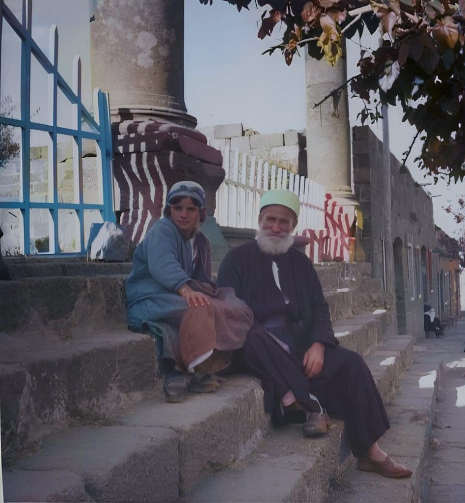 صورة لشيخ وحفيده في شهبا في جبل العرب عام 1938.