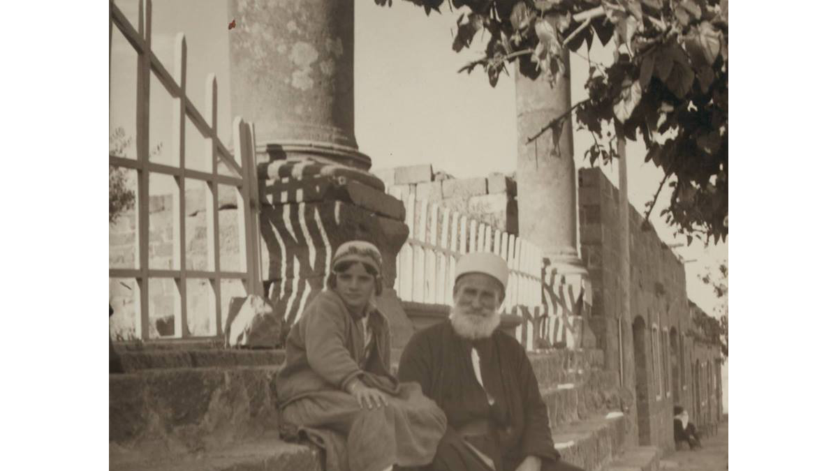 صورة لشيخ وحفيده في شهبا في جبل العرب عام 1938.